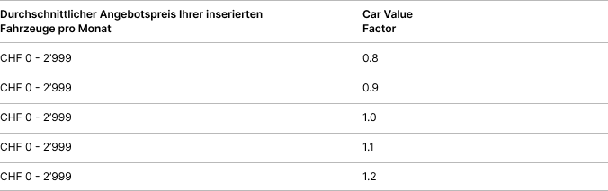 Der Car Value Factor variiert monatlich je nach Angebotspreis zwischen 0.8. und 1.2. Entnehmen Sie den jeweiligen Car Value Factor aus der Tabelle.